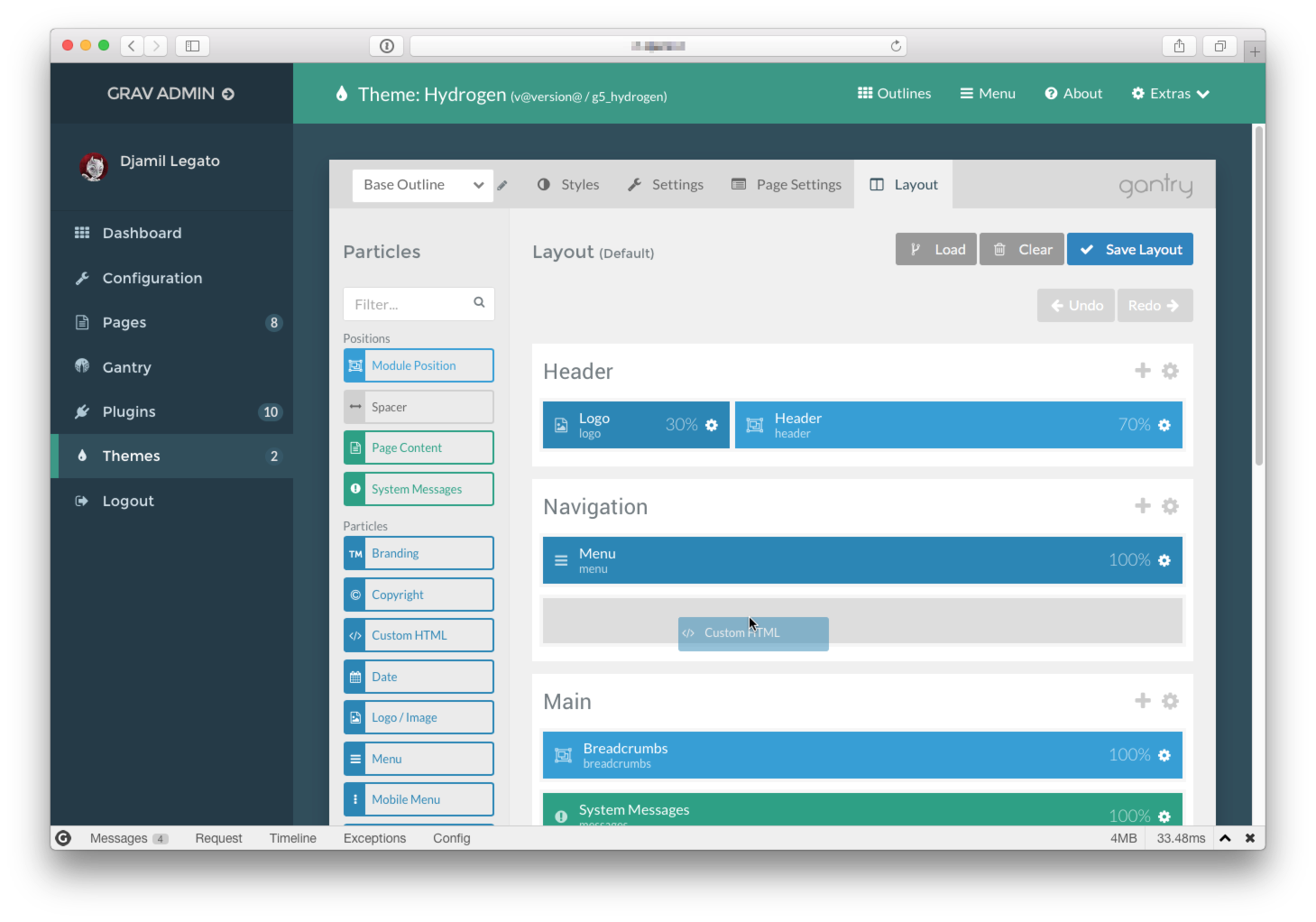 grav-tpl, is Gantry's free theme Hydrogen. Hydrogen is a blank canvas that you can use to get familiar with Gantry and it will help you get started. Unzip the theme package and move the folder underuser/themes/g5_hydrogen.All you need to now is head to the admin, activate Hydrogen under Themes and you will see that a [ Gantry ] entry is now available in the sidebar. This is where all the Gantry themes will be listed at.